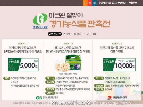 경기농식품유통진흥원은 기해년 첫 명절, 설을 맞이해 1월 8일부터 29일까지 우체국쇼핑몰 내 경기 도지사인증 ‘G마크 인증상품 특별관’에서 다양한 이벤트를 추진한다고 8일 밝혔다.