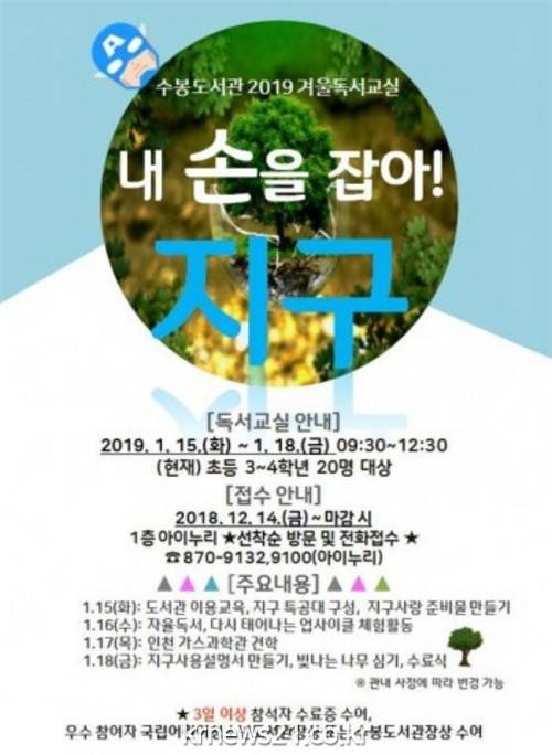 인천광역시가 설립하고 인천광역시도서관발전진흥원이 운영하는 수봉도서관(관장 심민석)은 15일부터 18일까지 총 4일간 지역 내 초등학생을 대상으로 겨울독서교실을 운영한다.