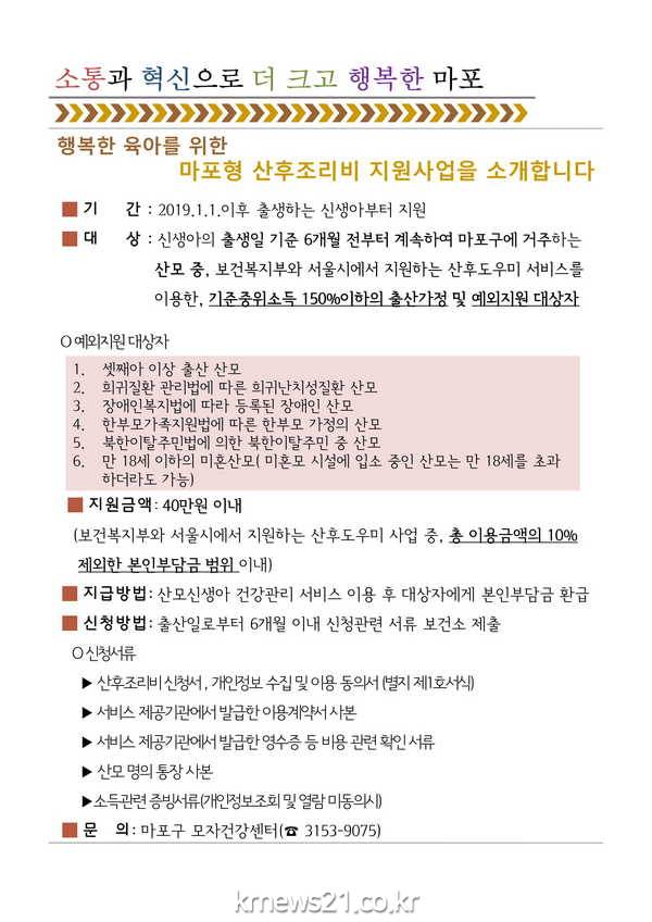 올해 1월 1일 이후 출생한 신생아부터 마포형 산후조리비 지원이 적용된다. 지원 대상은 신생아 출산일 기준 6개월 전부터 계속해서 마포구에 거주하는 기준중위소득 150%이하 출산 가정 또는 셋째아 이상 출산산모, 희귀난치성질환 산모, 장애인 산모, 미혼모 산모 등 예외지원 대상자이다.