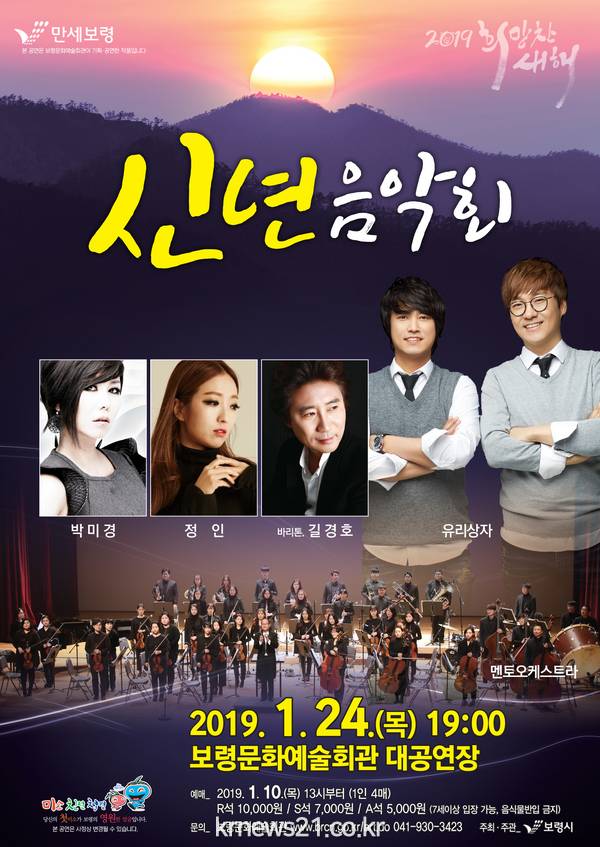 이번 신년음악회는 기해년 새해 실력파 가수를 많이 초청해 시민들에게 힘찬 새해의 메시지를 전달하기 위해 마련됐으며, 멘토오케스트라가 연주를 맡고 박미경과 정인, 유리상자, 바리톤 길경호가 함께하여 멋진 협연을 선보인다.