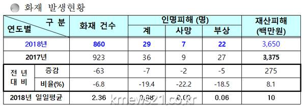 이는 전년보다 화재건수 6.8%(63건), 인명피해 19.4%(7명) 등은 감소하고, 재산피해는 8.1%(2억7000여 만원) 증가한 수치다.