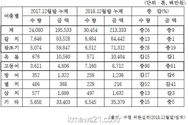 고등어 등 기타 어종은 14,687톤․4백7십1억원으로 2017년말(10,684톤 ‧4백1십5억원) 대비 위판량은 37%, 위판액은 13% 증가했다.