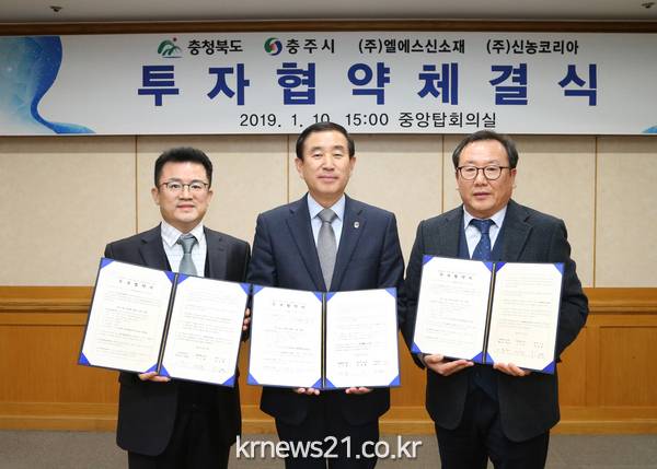 충주시와 충청북도는 10일 충주시청 중앙탑회의실에서 ㈜LS신소재와 ㈜신농코리아 등 2곳의 기업과 투자금액 560억, 신규고용 65명 규모의 투자협약을 체결했다.