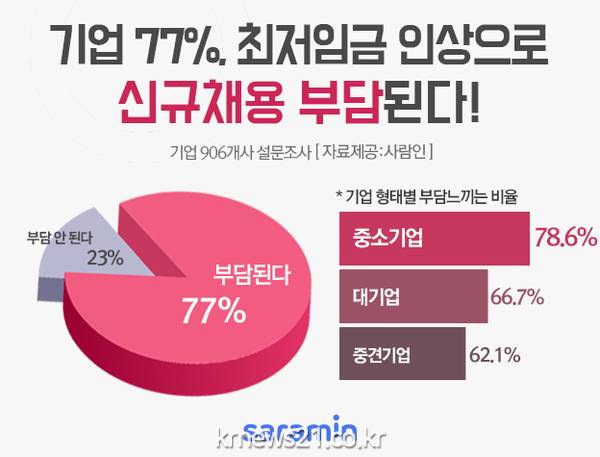 구인구직 매칭플랫폼 사람인(www.saramin.co.kr 대표 김용환)이 기업 906곳을 대상으로 ‘2019년 최저임금 인상에 따른 신규채용 부담’을 주제로 조사한 결과, 77%가 ‘신규채용에 부담을 느낀다’고 답했다.