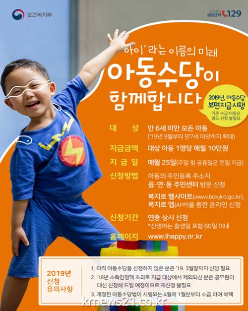 신청대상은 2013년 2월 1일 이후 출생한 아동(0~71개월) 중 아동수당을 한번도 신청한 적이 없는 아동이며, 1월부터 3월말까지 신청하면 4월 25일에 1월 ~ 3월분 아동수당까지 소급하여 받을 수 있다.