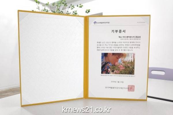 한국백혈병어린이재단은 ‘엑소 카이 팬커뮤니티 종달새’의 이름으로 기부증서를 발급했으며, 증서에는 ‘봄처럼 따뜻한 카이처럼 이 기부가 아이들에게 따뜻하게 닿기를 바랍니다’라는 팬들의 기념 메시지가 담겼다.