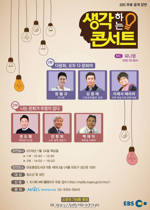 오는 24일(목), 마포구(구청장 유동균) 마포중앙도서관에서 EBS 무료 공개 강연 ‘생각하는 콘서트’가 열린다.