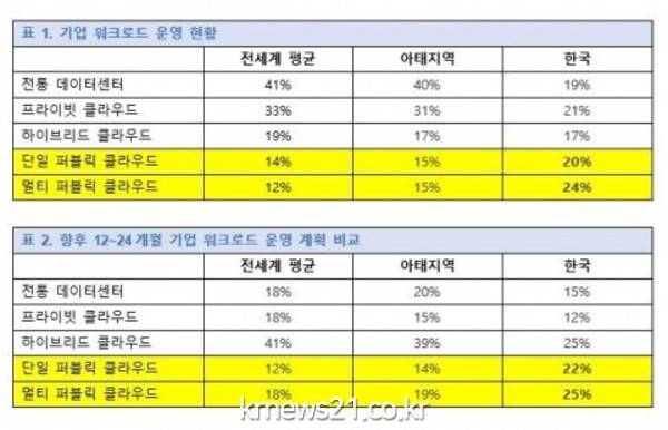 보고서에 따르면 한국 응답자의 24%가 이미 워크로드 및 애플리케이션을 멀티 퍼블릭 클라우드 환경에서 운영 중이다. 전세계 평균의 2배, 아태지역 평균보다 60% 앞선 수치다. 또한 단일 퍼블릭 클라우드 사용량 및 도입 부문에서도 20%라는 높은 응답률을 보였다. 전세계 평균과 아태지역 평균은 각각 14%, 15%였다.