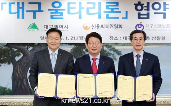 권영진 대구광역시장, 이계문 신용회복위원회 위원장, 이찬희 대구신용보증재단 이사장은 1월 21일 11시 30분 대구시청 상황실에서‘대구 울타리론’ 협약을 체결했다.