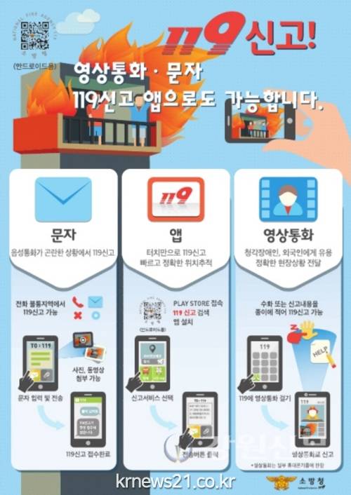 ▲ (사진=소방청)올해부터 ‘119영상 신고 접수시스템’이 새로 도입된다. 화재·구조·구급상황 발생 시 119로 신고하면 영상통화로 신고자의 현장상황에 맞는 응급처치 지도 등 신속한 조치로 황금시간 달성률을 한 단계 더 끌어 올릴 수 있을 것으로 기대된다. 한편 지난해 12월부터 119 구급 신고자에게는 구급차 실시간 위치 및 구급대원 연락처 등 출동정보를 문자로 전송해 주는 서비스를 실시하고 있다.