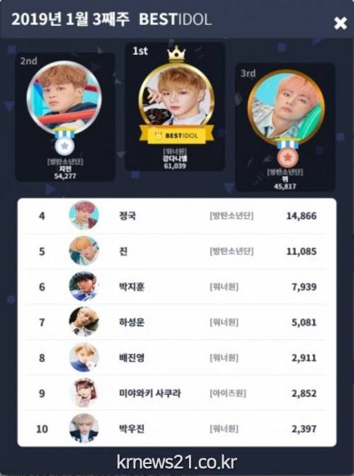 49주간 한 번도 놓치지 않은 1위를 지키려는 강다니엘과 그 자리를 노리는 지민, 뷔의 순위 다툼이 너무나 뜨거웠고, 순위 다툼 또한 손에 땀을 쥐게 했다.