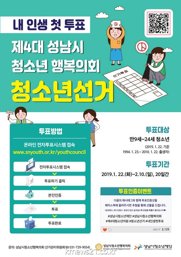 성남시 청소년 행복 의회 대표성을 강화하고 청소년의 참여 의식 향상을 도모하고자 실시하는 이번 선거의 투표대상은 만9세~24세 청소년이 선거일(2019.1.22.) 기준 1994.1.23.~2010.1.22. 출생자이며, 투표 기간은 2019.1.22.(화)~2.10.(일), 20일간 성남시 청소년 행복 의회 전자투표시스템(www.snyouth.or.kr/youthcouncil)을 통해 참여할 수 있다.