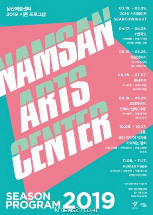 2019년 시즌 프로그램의 막을 올리는 ‘7번국도(작 배해률/연출 구자혜, 4월 17일~28일)’는 남산예술센터 상시투고시스템 ‘초고를 부탁해’를 통해 발굴된 작품이다. ‘서치라이트(Searchwright)’에서 낭독공연으로 관객들과 먼저 만났고 이어 시즌 프로그램까지 단계별 제작 시스템을 거쳤다. 낭독공연에 이어 구자혜 연출이 함께 해 사회적 참사의 피해자들을 연극이 어떻게 직시해야 하는가에 대한 질문을 던진다. 젊은 극작가 배해률의 첫 장막희곡이라는 점에서 눈길을 끈다.