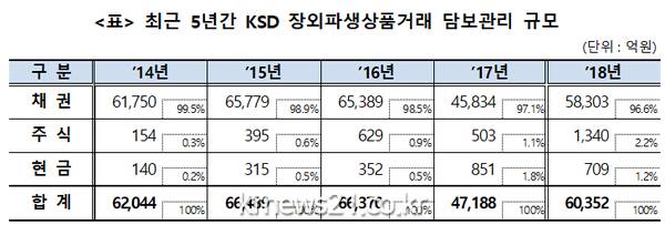 2018년 말 기준 한국예탁결제원(이하 예탁결제원)이 관리하는 장외파생상품거래 담보관리금액(평가액 기준)은 6조352억원으로 전년 말(4조7188억원) 대비 27.9% 증가했다.