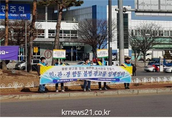 ▲ (사진=광주광역시청)광주광역시는 설 명절을 맞아 쾌적한 도시환경을 제공하기 위해 24일 유관기관과 합동으로 광주역과 광주송정역 등 주요 도로변을 중심으로 ‘불법광고물 합동정비 및 캠페인’을 펼쳤다.