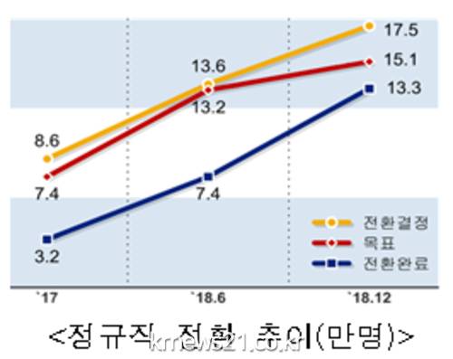 이에 따르면 공공부문에서 비정규직을 정규직으로 전환하기로 결정한 인원은 17만5000명에 이른다. 이는 2020년까지 정규직 전환목표로 했던 규모(20만5000명: 기관별 계획 17만5000명+추가전환 여지 3만명)의 85.4%에 해당된다.