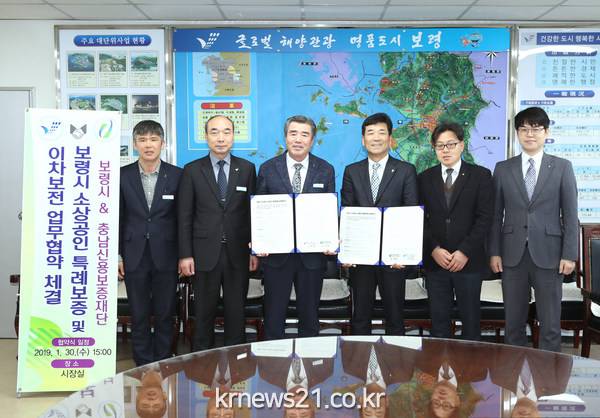▲ 업무위탁 협약 체결 장면보령시는 지난 30일 오후 시장실에서 김동일 시장과 유성준 충남신용보증재단 이사장 등 관계자가 참석한 가운데 소상공인 특례보증 및 이차보전 지원 업무위탁 협약을 체결했다.