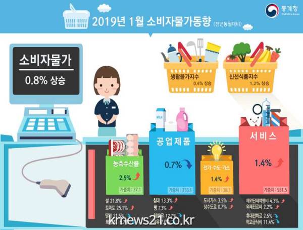 통계청이 1일 발표한 1월 소비자물가 동향을 보면 올해 1월 소비자물가지수는 104.24로 지난해 1월보다 0.8% 상승했다.