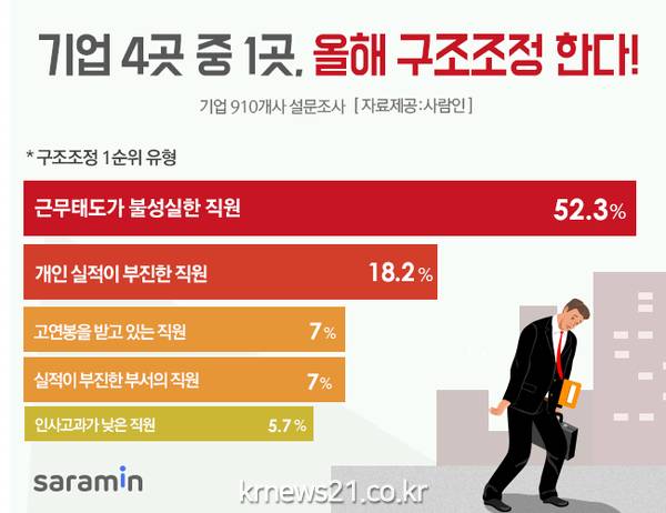 구조조정 대상으로는 ‘근무태도가 불성실한 직원’(52.3%)을 1순위로 꼽았다. 또, 개인 실적이 부진한 직원’(18.2%), ‘고연봉을 받고 있는 직원’(7%), ‘실적이 부진한 부서의 직원’(7%), ‘인사고과가 낮은 직원’(5.7%), ‘비정규직 직원’(3.2%) 등도 구조조정 대상인 것으로 나타났다.