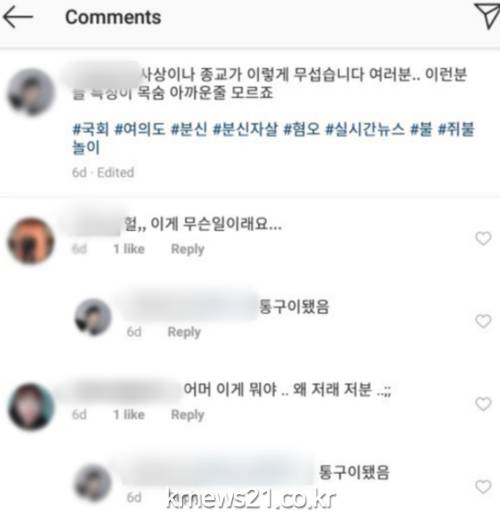 이어 자신이 올린 사진에는 ‘#국회 #여의도 #분신 #분신자살 #혐오 #실시간뉴스 #불 #쥐불놀이’ 등의 해시태그와 "이게 무슨 일이냐"는 댓글에는 "통구이 됐어 ㅋㅋ" "통구이됐음"이라는 답글을 달았다.