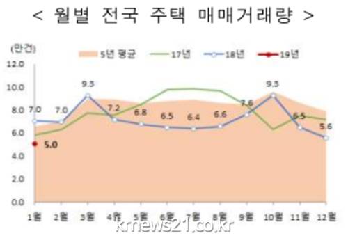 ▲ (사진=국토교통부)’19.1월 주택 매매거래량은 50,286건으로 전년동월(70,354건) 및 5년 평균(65,950건) 대비 각각 28.5%, 23.8% 감소했다.