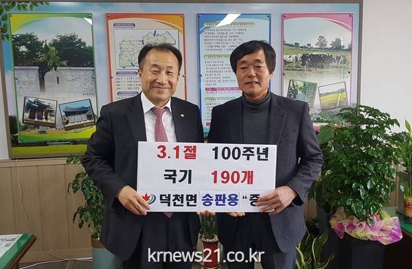 정읍시 덕천면 기업인 송판용 대표(대성가설재)는 19일 태극기 190개를 덕천면사무소에 기증했다.