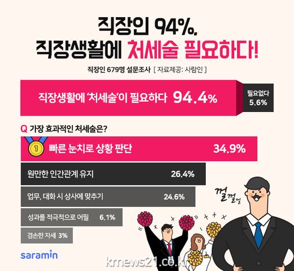 직장생활을 할 때 업무 역량도 중요하지만 능력을 인정받는 데 있어 적절한 처세술도 필요하다. 실제로 구인구직 매칭플랫폼 사람인이 직장인 679명을 대상으로 ‘직장 내 처세술’에 대해 조사한 결과, 94.4%가 직장생활에 처세술이 ‘필요하다’고 답했다.