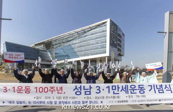9시부터 성남시청광장에서 시민이 참여하는 ‘독립선언서 쓰기’, ‘태극 나무 만들기’, ‘태극 손거울 만들기’ 등 각종 체험행사와 시민단체, 학생 300여 명이 함께하는 「태극 길놀이」가 펼쳐지고, ART+와 가수 성국의 「소녀와 꽃」 헌정 공연, 성남 캘리그라피협회의 「3·1운동 100주년 휘호 퍼포먼스」가 진행된다.