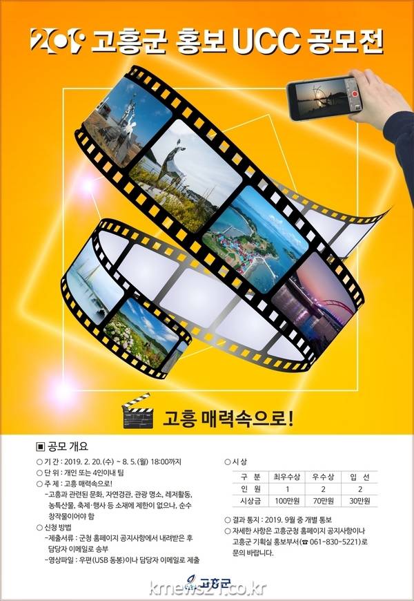 고흥군(군수 송귀근)은 고흥의 매력을 알릴 참신한 홍보 아이디어를 발굴하기 위해 ‘2019 고흥 홍보 UCC 공모전’을 개최한다.