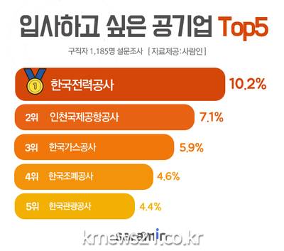 구인구직 매칭 플랫폼 사람인(www.saramin.co.kr 대표 김용환)이 구직자 1,185명을 대상으로 ‘입사하고 싶은 공기업 및 공공기관’을 조사한 결과 ▲한국전력공사가 10.2%로 1위를 차지했다.