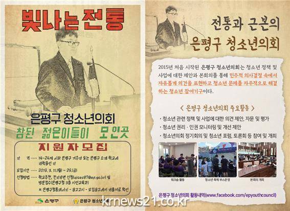 ▲ (사진=은평구 제공, 청소년의회 모집포스터)은평구(구청장 김미경)가 청소년의 권익증진 및 정책참여 활성화를 위해 ‘제5대 은평구 청소년의회’ 의원을 모집한다고 밝혔다.