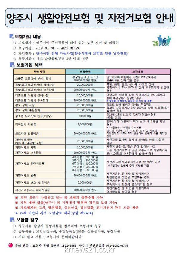 양주시(시장 이성호)는 전 시민을 대상으로 각종 재난․사고로 인해 신체적 피해를 입었을 경우 보상받을 수 있는 생활안전보험과 자전거보험의 보장을 확대하는 등 사회안전망을 강화한다.