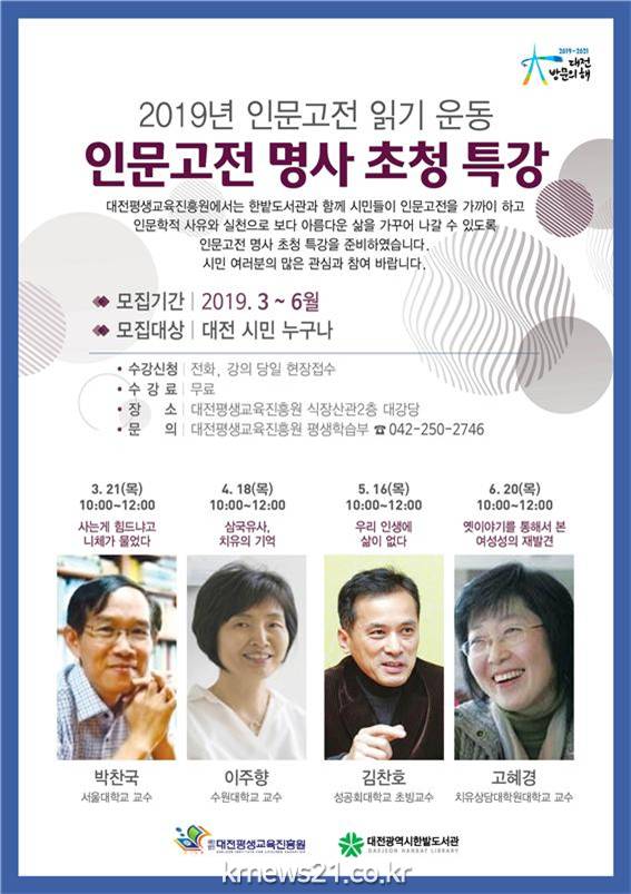 대전평생교육진흥원은 한밭도서관과 함께 시민들이 인문학적 지혜로 삶의 풍요로움을 얻을 수 있도록 ‘인문고전 명사초청 특강’을 마련했다.