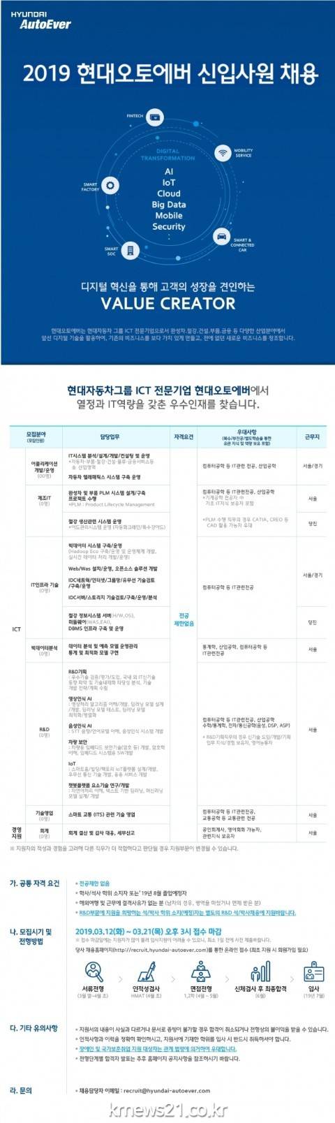디지털 혁신을 통해 고객의 성장을 견인하는 Value Creator를 찾는 현대오토에버의 신입사원 입사지원은 3월 21일(목) 오후 3시까지 현대오토에버 채용 홈페이지를 통해 가능하다.