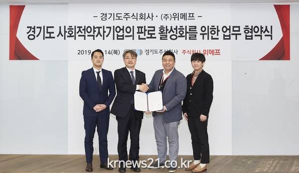 코리아경기도 주식회사는 위메프와 지난 14일 위메프 본사에서 이 같은 내용을 골자로 한 ‘경기도 사회적 약자 중소기업의 소셜커머스 진출 판로 활성화를 위한 업무협약(MOU)’을 체결했다고 15일 밝혔다.