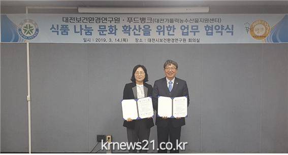 ▲ (사진=대전시청 제공)대전시 보건환경연구원은 14일 오후 2시 30분 연구원 회의실에서 대전가톨릭농수산물지원센터 푸드뱅크와 식품나눔 협력체계 구축을 위한 업무협약을 체결했다.