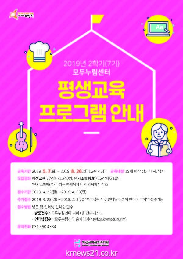 화성시 여성 가족재단(대표이사 노영래)은 2019년 2학기 평생교육 수강생을 모집한다.