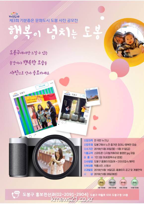 도봉구(구청장 이동진)가 ‘제3회 기분 좋은 문화도시 도봉구 사진공모전’의 주제를 ‘행복이 넘치는 도봉’으로 정하고, 전 국민이 담은 도봉구의 다양한 모습을 기다린다.