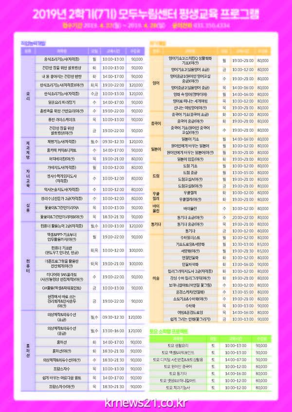 이번 2019년도 2학기 평생교육 프로그램은 직업능력개발과 자기계발, 토요 소확행, 단기특강 등 유앤아이센터 79개 강좌 1,552명, 모두누림센터 89개 강좌 1,450명을 모집하며, 교육기간은 2019년 5월 7일부터 8월 26일까지 총 4개월 동안 진행된다.