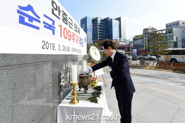 의정부시(시장 안병용)는 3월 26일 의정부 역전근린공원 안중근 동상 앞에서 안중근 의사 순국 109주기를 맞이하여 선열의 호국정신을 기리고 3․1 운동 및 대한민국 임시정부 수립 100주년을 기념하기 위한 추모식을 개최했다.