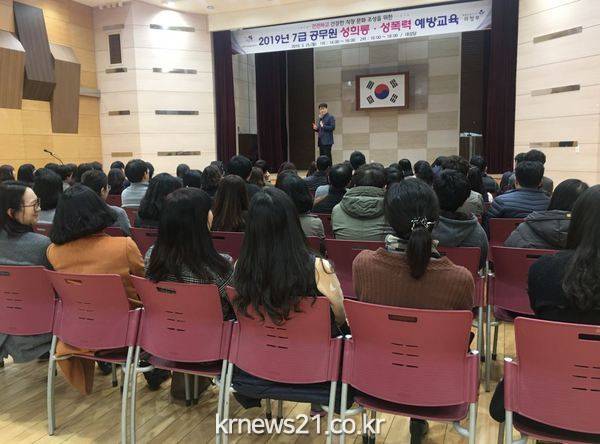 의정부시(시장 안병용)는 3월 25일 2회에 걸쳐 의정부시청 대강당에서 7급 공무원 352명이 참석한 가운데 ‘2019년 7급 공무원 성희롱·성폭력 예방 교육’을 실시했다.