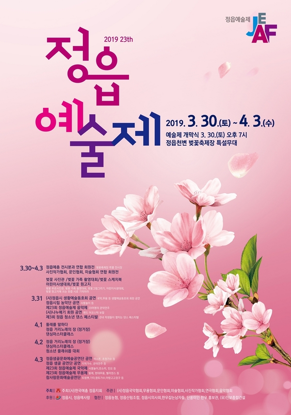 예술제는 내달 3일까지 닷새 간 정읍천변 일원에서 펼쳐진다. 시민들과 소통하고 교감하기 위한 예술축제로, ‘2019 정읍벚꽃축제’와 함께 진행된다.