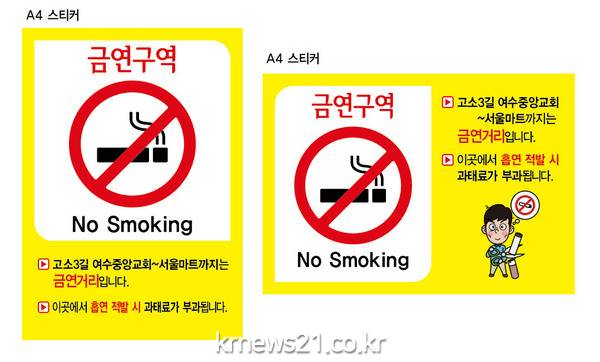 이번에 고시된 금연구역은 고소3길 여수중앙교회부터 한신아파트 입구 서울마트까지 615m 구간과 거북선공원 전체다.