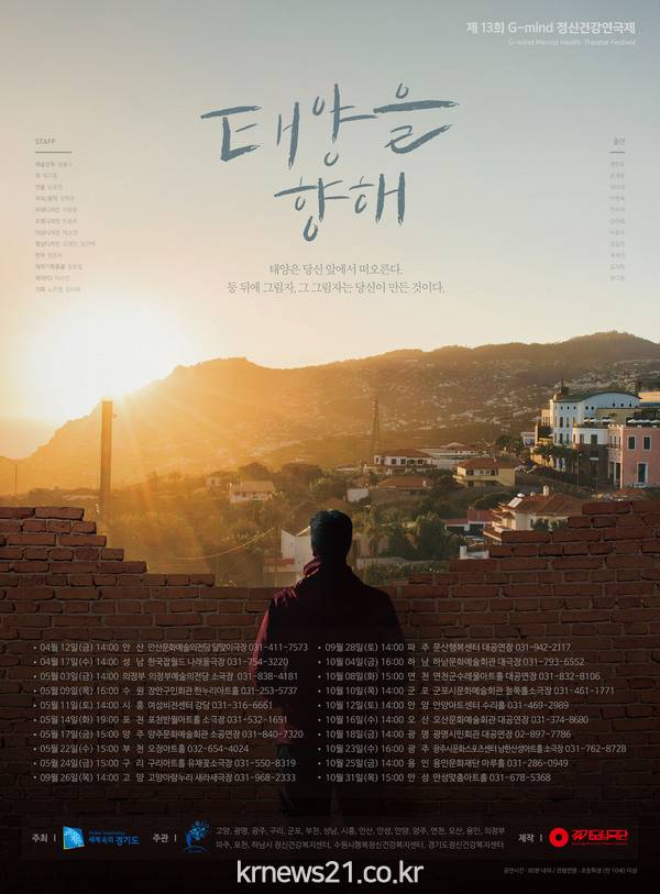 ‘태양을 향해’ 공연 관람을 원하는 도민은 누구나 무료로 관람할 수 있으며, 상세 일정 등 기타 자세한 사항은 경기도 정신건강 복지센터 홈페이지(www.mentalhealth.or.kr) 또는 전화(☎031-212-0435)로 문의하면 된다.