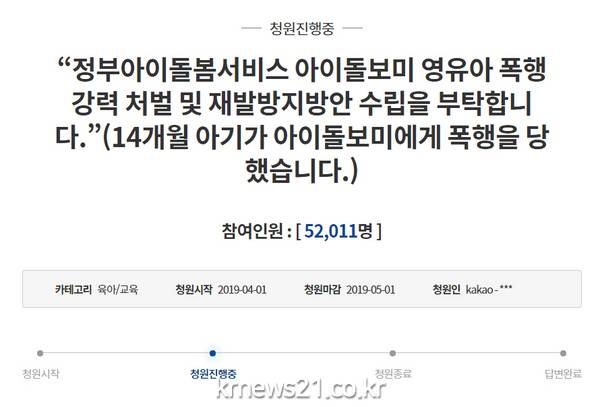 1일 청와대 국민청원게시판에 '정부아이돌봄서비스 아이돌보미 영유아 폭행 강력 처벌 및 재발방지 수립을 부탁합니다(14개월 아기가 아이돌보미에게 폭행을 당했습니다)'라는 제목으로 글이 올라왔다.