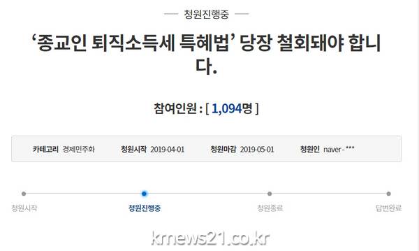 청원 글에 따르면 “이번 특혜법안은 공청회 한번 없이 일사천리로 군사작전 하듯이 진행되고 있다”며 “이는 절차적 민주주의 위반이며 종교인에 대한 명백한 특혜”라고 주장했다.