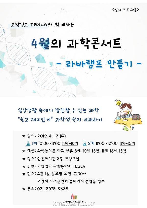 고양시 신원도서관은 매월 둘째 주 토요일에 어린이들의 과학적 호기심을 자극하고 어린이들이 과학의 기초 원리를 쉽게 익힐 수 있는 ‘2019년 과학콘서트’를 운영한다. 4월부터 매월 참여자를 모집하며 모집 인원은 8~10세 15명, 11~13세 15명으로 총 30명이다.