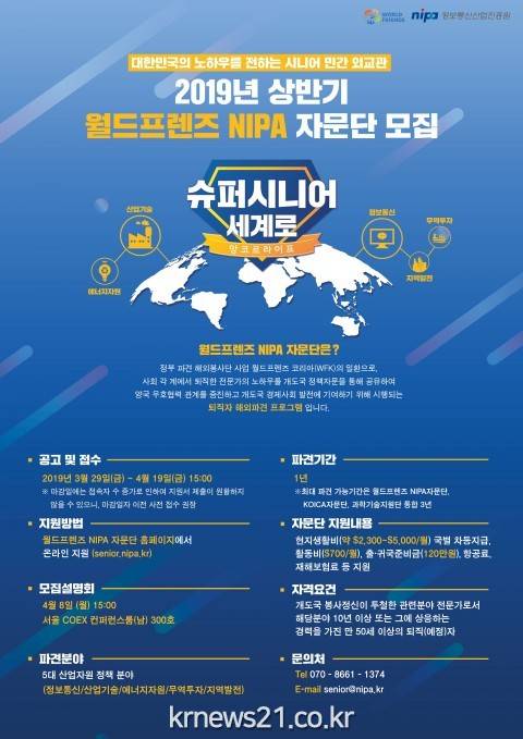 ▲ (사진=정보통신산업진흥원 제공)정보통신산업진흥원(원장 김창용, 이하 ‘NIPA’)은 국내 퇴직 전문인력 해외파견 프로그램인 ‘월드프렌즈 NIPA 자문단’의 2019년 상반기 지원자를 3월 29일부터 4월 19일까지 3주간 모집한다고 밝혔다.