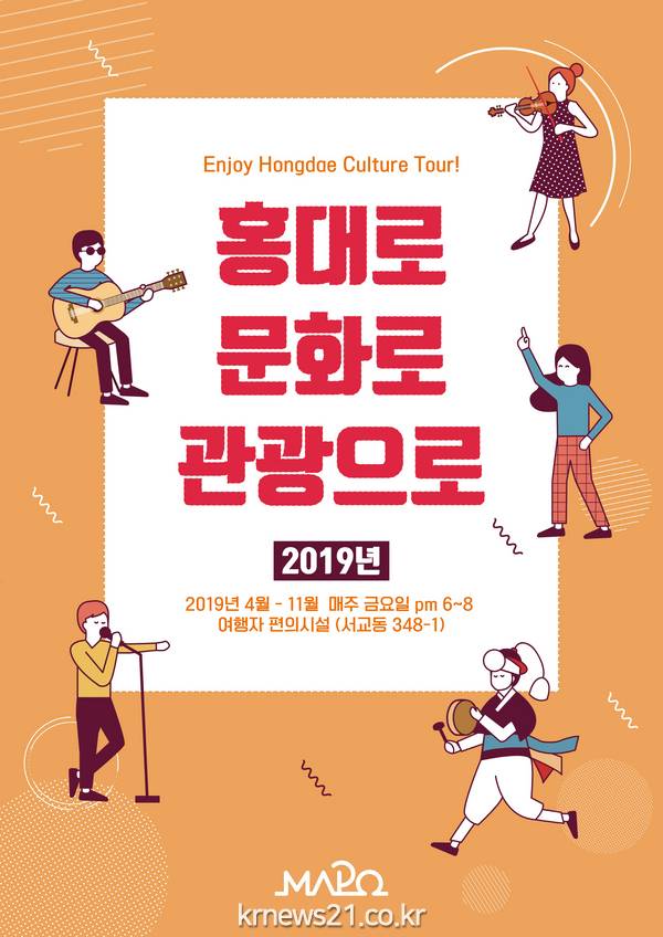 공연은 오는 11월까지 매주 금요일 저녁 6시 여행자편의시설(서교동 348-1)을 주 무대로 하여 홍대 걷고싶은거리 야외공연장 3곳과 인근 거리 등에서 진행된다.