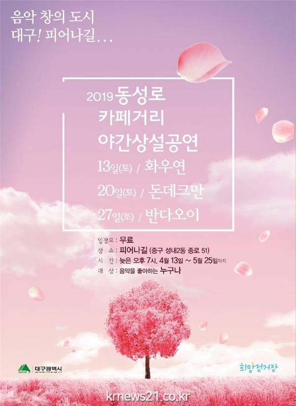 동성로 카페(식당) 야간상설공연은 과거 요정(料亭)이 흥했던 종로에 지난해 9월 자비로 풍류문화 전시관 등을 조성한 ‘피어나길’의 카페 설하정(중구 종로49-5) 앞마당에서 4월 13일부터 5월 25일까지 매주 토요일 저녁 7시에 총 7회 개최한다.